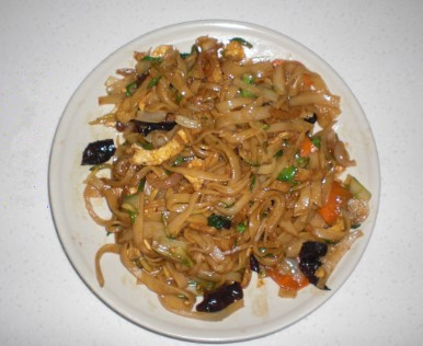 3.起鍋熱油,先倒入小洋蔥翻炒片刻后再依次放入白菜根、胡蘿卜片、黑木耳及白菜葉翻炒片刻,倒入涼皮,倒入醬汁、老抽,繼續翻炒片刻后,較后倒入蛋皮。